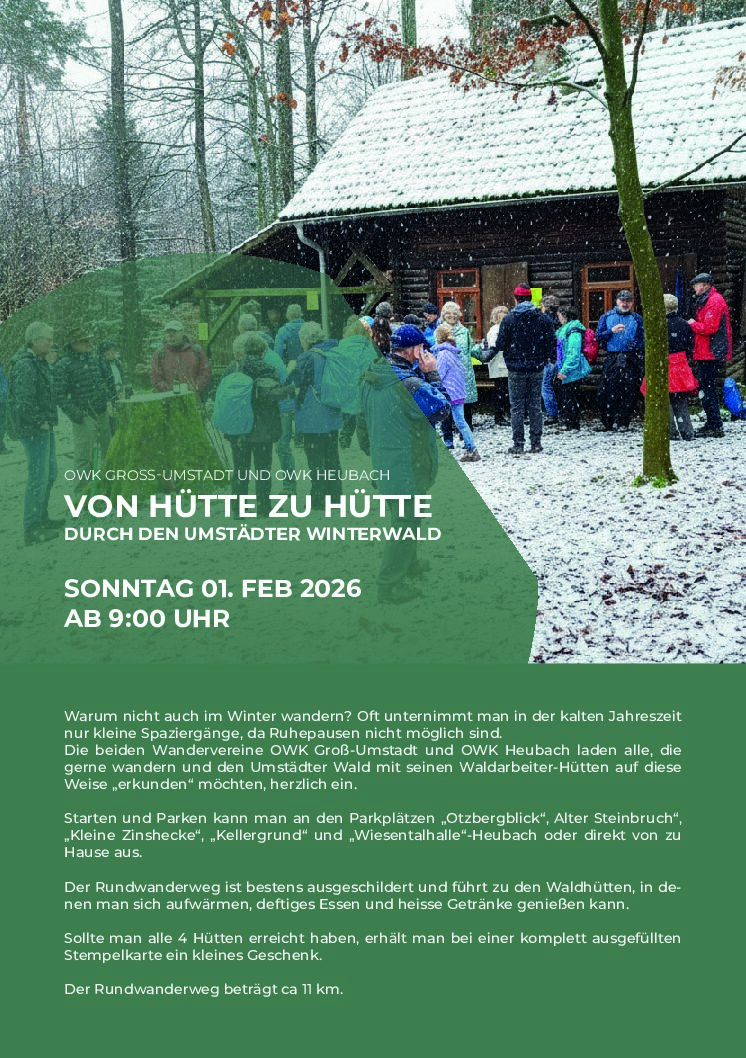 Am Sonntag, den 01. Februar 2026, warten ab 9 Uhr wieder vier Hütten im Umstädter Wald darauf, erwandert zu werden. Warum also nicht mit Freunden und Bekannten bei hoffentlich schönem Winterwetter ein paar abwechslungsreiche Stunden in der Natur verbringen. Ein etwa elf Kilometer langer Rundwanderweg ist bestens ausgeschildert und für alle Altersgruppen geeignet. Ein Einstieg ist von allen Startpunkten aus problemlos möglich, auch Teilstrecken können gewandert werden. Die vier früheren Waldarbeiter-Hütten sind an diesem Tag von den beiden OWK-Ortsgruppen bewirtschaftet. Damit ist sichergestellt, dass sich die Wanderer aufwärmen und mit deftigem Essen und Getränken stärken können. Bitte eigene Becher mitbringen!